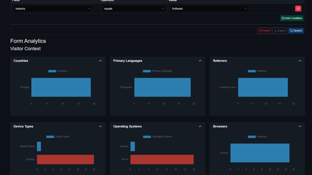 SnapForms provides built-in analytics and filtering capabilities that allow administrators to segment and analyze submissions by: